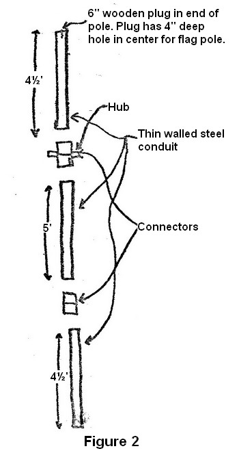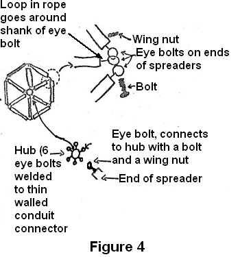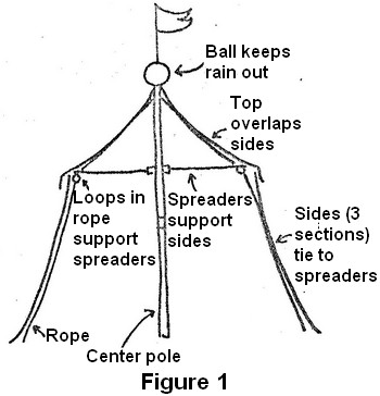 ![]() OverviewMy pavillion design (see figure 1) has a single center pole (no side poles) and no external ropes (also know as "trip lines"). It not only looks good, it is also historically accurate (except for materials), moderately waterproof, can easily be set up by two people, and is not impossibly heavy to lug to the the camp site. Making the Center PoleThe central pole (see figure 2) is made out 3 pieces of 1½″ O.D. thin walled steel conduit. The pieces are joined together with steel tubular connectors. (Do not use cast metal connectors, these are not strong enough!) A shaped wooden plug is inserted in the top of the upper piece to hold the flagpole. This plug should fit snugly into the top of the centerpole, but be wider at the top so that it does not get pressed down into the pole when the fabric is tensioned. Drill a hole into the shaped plug to accomodate the flagpole.Making the Center HubTo make the center hub, weld six eye bolts to the steel tubular connector that will be used to connect the upper two center poll segments. The distance between the center of opposite eyebolts should be four inches. If it is not, you will need to adjust the length of the spreaders accordingly.Making the SpreadersMake 12 spreaders (see figure 3) out of knot free 2x2 lumber, six for the sides, and six that radiate out from the central hub and connect to the side spreaders. The six side spreaders should be six foot seven inches long, measuring between the centers of the holes of the eyebolts that are at each end. If the distance between the center of opposite eyebolts on the hub is four inches, the length to the radiating spreaders should be six foot five inches. If the distance between the center of opposite eyebolts on the hub is not four inches, the length of the radiating spreaders should be six foot seven inches minus half of the distance between the center of opposite eyebolts on the hub. Drill a pilot hole in each end and screw the eye bolts in. Adjust the depth of the eyebolts to get the correct total length. Making the FlagpoleDo not omit the flagpole, it is not simply decorative. The flagpole serves two vital purposes: