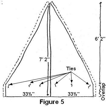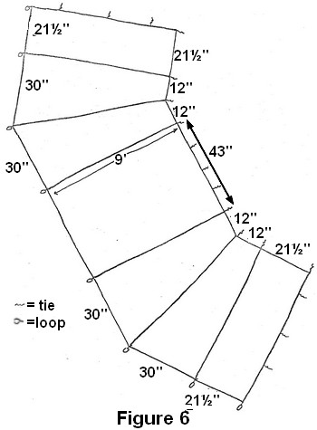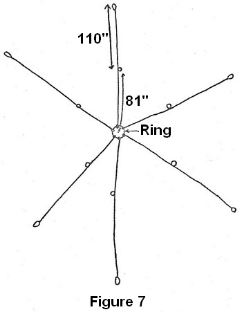 To make the flagpole you will need a moderately heavy dowel (⅝″ is about right), a ball about 6 inches in diameter (I use a plastic toilet float, painted gold) and, optionally, a banner. Make a hole through the center of the ball. The diameter of the hole should allow for sliding the ball very snugly onto the pole. There should be no gaps between the ball and the pole through which water may trickle down the pole and into the pavillion. The ball should sit touching the top of the pavillion when the flagpole is installed into the hole that you drilled into the shaped plug at the top of the centerpole. Leave enough dowel length above the ball to fly your banner. Fabric and SewingSelect strong densely woven fabric for the sides and top. Canvas is a good, period choice. If possible, get wide enough fabric to make sections out of single pieces, it will save a great deal of time. Flat fell all seams. Use heavy twill tape for all ties and loops on the top and sides (the loops in the rope are simply part of the rope). The ties are 12″ lengths of heavy twill tape folded in half with the center 1″ stitched to the fabric leaving two 5″ ties free. The loops are 8″ lengths of heavy twill tape folded in half with the end 2″ stitched to the fabric making a 2″ diameter loop. Making the TopMake six top pieces as shown in figure 5 and sew them together (the ties are sewn to the inside). Cut a circle of fabric 6″ in diameter and cut a 1″ hole in the center. and sew it to the center of the top on the inside as a reinforcement. Making the SidesMake three sides as shown in figure 6. The ties are sewn on the top and sides and the loops on the bottom. Tent PegsThe best tent pegs I have found are the 12″ bolts that are used to hold cable spools together. A little dumpster diving in areas where new cable is being installed will yield as many of these as you can use. You will need 7 to set up the pavillion. Waterproofing the FabricI strongly recommend that you use a paint on waterproofing, not the spray version. The spray versions are typically intended for light nylon tents and may not be up to the task of waterproofing canvas. Making the RopesMake the ropes as shown in figure 7. Use a non-stretch rope like sisal or hemp. Don't use nylon or polyester. Cut three lengths of rope each 33 feet long. Fold each length of rope in half and secure the center of the rope to a sturdy ring with a Lark's Head knot. The ring should be sturdy (it will be under a great amount of tension), large enough diameter to fit, with ropes attached, over the flagpole and a small enough diameter so that it can't slide down the centerpole. Tie a Bowline Knot to make the loops to support the spreaders. Tie a Prusik the ends of each rope to itself. These adjustable loops will go round the tent pegs. Setting Up the PavillionUnlike most tents where the tent pegs are the last step, putting in the tent stakes is the first step in setting up the pavillion. To determine where to put the tent stakes, make a triangle of light non-stretch rope 103″ on a side. Put a small loop into each corner of the triangle. Pound in a stake where you want the center of the pavillion and put a loop over the stake. Put a stake into each of the other 2 loops. Stretch the cord tight and pound in the 2 stakes where you want the opening of the pavillion. Take the loop off one of the outside stakes and measure the position for the next stake. Repeat this process until all six outside stakes are in place. The stakes should be in a very neat hexagon pattern. If they are not, re-measure and fix it before continuing. Now that the stakes are in place the pavillion goes together as follows:
