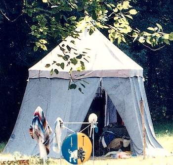 I made my first medieval pavillion in 1975. It worked, sort of. I knew my design was almost right, but it was not until I saw the June 1977 issue of "Smithsonian Magazine" that everthing just clicked. Within months I had built my second pavillion… and this one worked perfectly. I used this pavillion at many SCA (Society for Creative Anachronism) events and published directions on how to make one in 1980 in Volumn 2 Number 2 of my Household's newsletter, "Tyme Tracks" (long before the Internet was a repository for all knowledge).